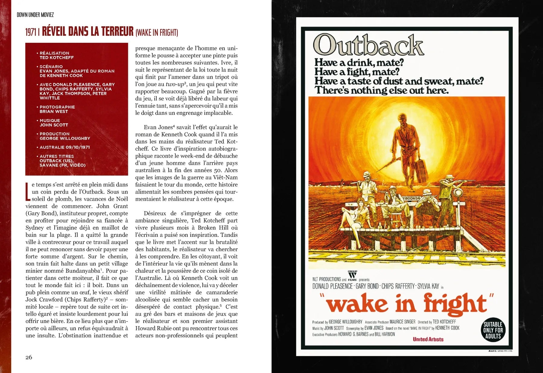 DOWN UNDER MOVIEZ se propose d’aller au-delà de la notion parfois vague d’Ozploitation, expression née en 2008 dans le documentaire Not Quite Hollywood de Mark Hartley, et de l’élargir à tout un corpus des années 1970 à nos jours, Nouvelle Vague y compris. Une sorte de guide pratique qui vous fera voyager aux quatre coins du pays, au travers d’une large sélection de films – des incontournables aux plus obscurs -, de dossiers thématiques, de portraits de personnalités et de nombreux entretiens inédits avec les cinéastes qui ont fait la renommée et la richesse de ce cinéma Down Under (George Miller, Peter Weir, Bruce Beresford, Gillian Armstrong…).